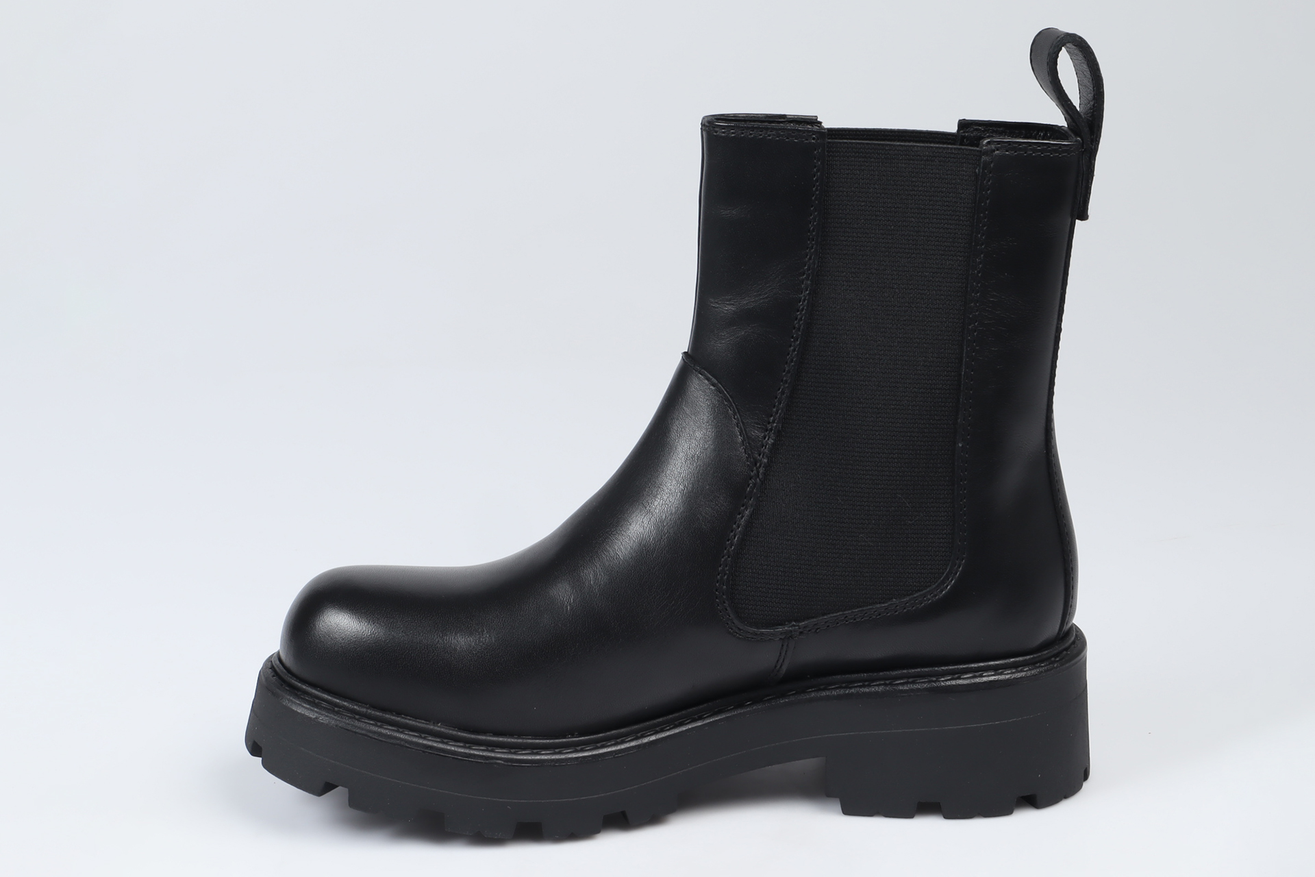 Cosmo 2.0 är chunky Chelsea boots med en biker-inspirerad design från Vagabond. Modellen är i svart skinn med resårpaneler längs skaftet, dragflikar och rundad tå. Klacken mäter 45 mm.