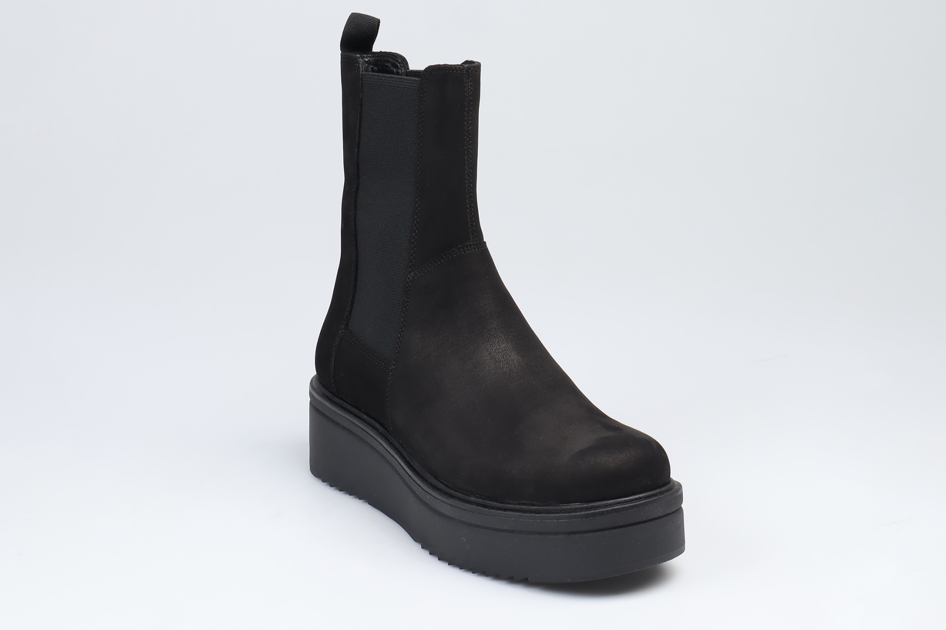 Tara är chunky Chelsea boots med platform-sula från Vagabond. Modellen är i svart nubuck med rund tå, dragflikar bak och resårpaneler längs skaftet. Sulan mäter 55 mm.
